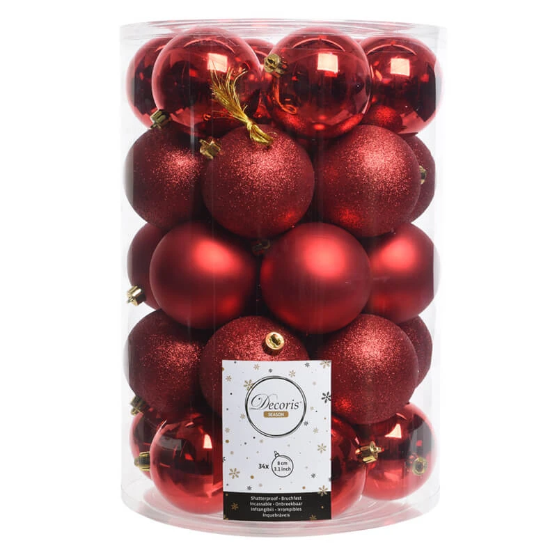 La confezione contiene 34 palline rosse, lucide, opache e glitterate, che addobberanno il vostro albero rendendolo unico.