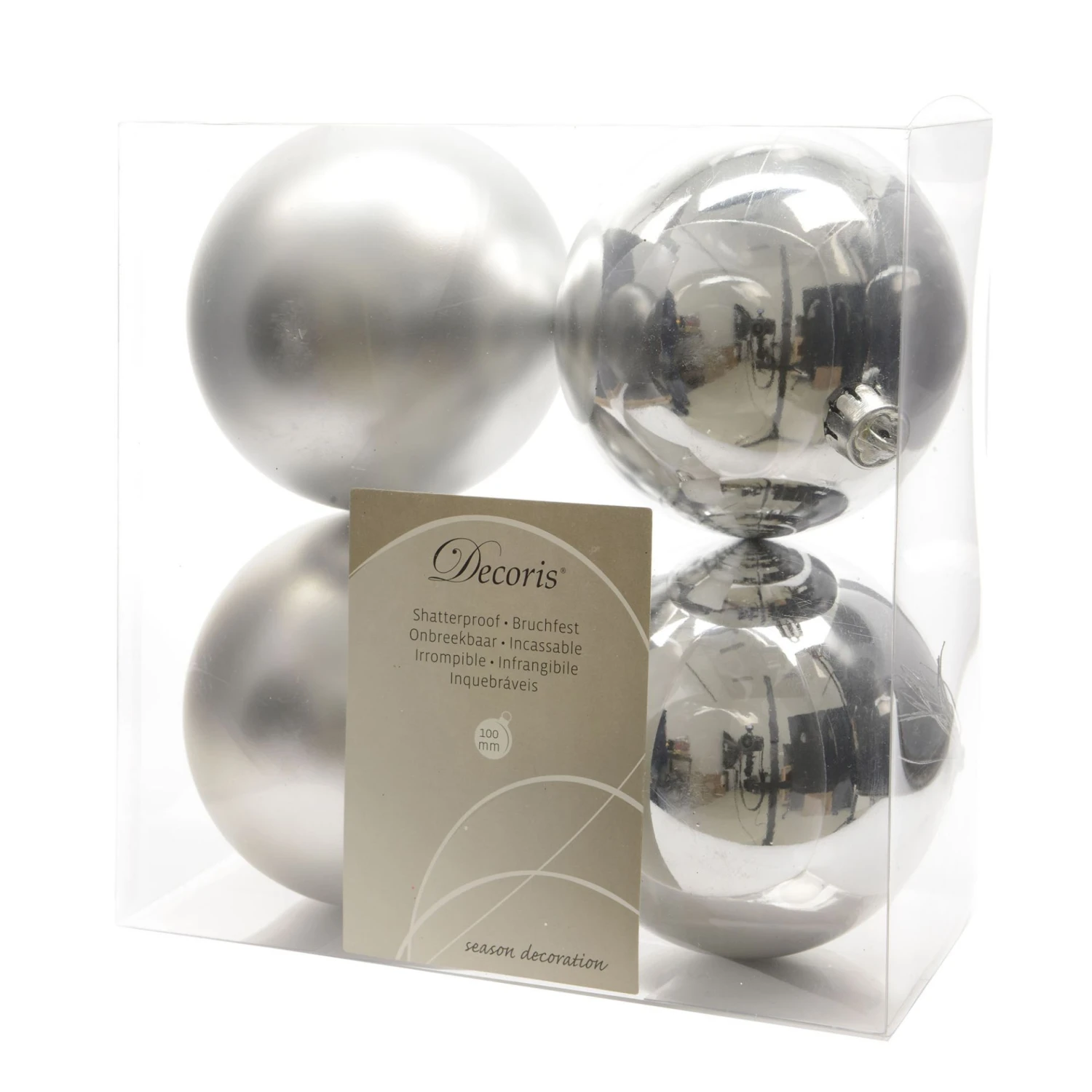 Set di 4 palline per Albero di Natale, color Argento, con diametro 10mm. il set è composto da due palline opache e due lucide.