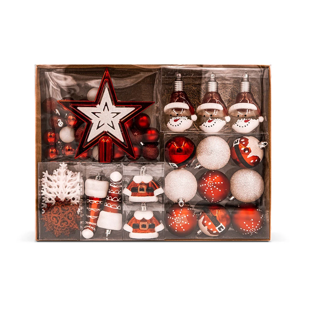 Decora il tuo Albero di Natale ed i tuoi ambienti grazie a questo Assortimento di Addobbi Natalizi di aTe Casa. Questo set comprende 70 elementi con decorazioni Natalizie di colore rosso e bianco, infrangibili.