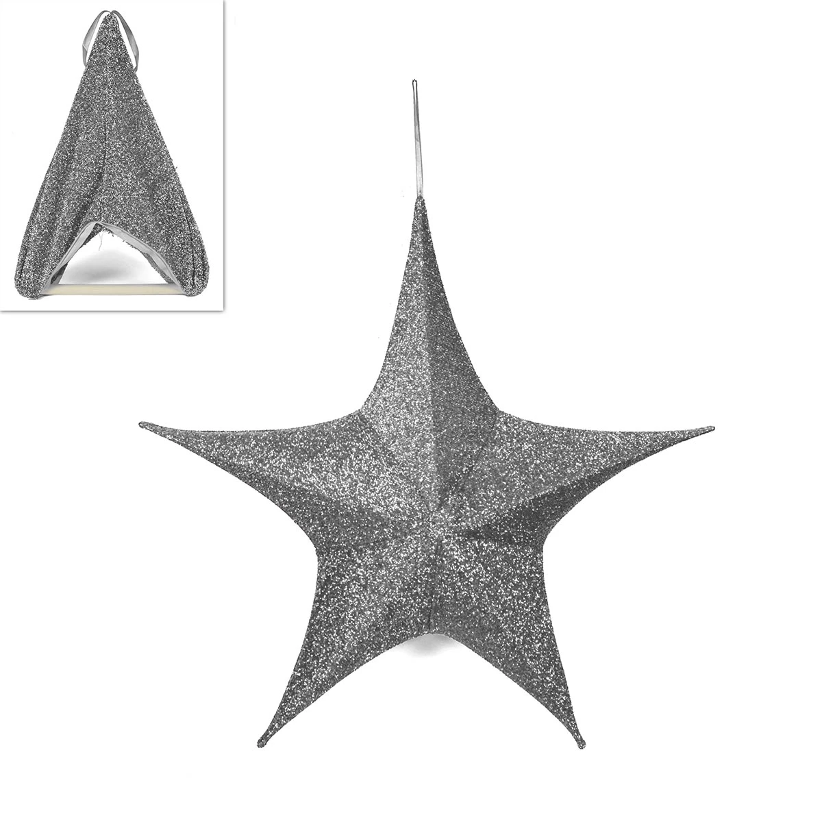 Stella di Natale di colore Argento da 80 cm da appendere. In tessuto glitterato, molto leggera, ha la possibilità di essere richiusa.