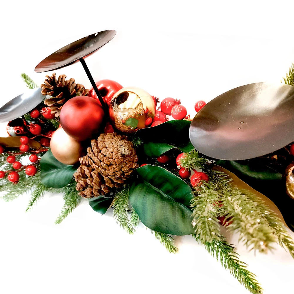 Decora la tua tavola con il Centrotavola Portacandele 3 Posti con Decorazioni Natalizie Bacche e Pigne! Il centrotavola ha tre diversi piedistalli su cui puoi appoggiare le tue candele preferite per dare una luce soffusa alle tue cene natalizie! I piedistalli per le candele sono circondati da rami di pino, palline di natale rosse e oro e pigne!