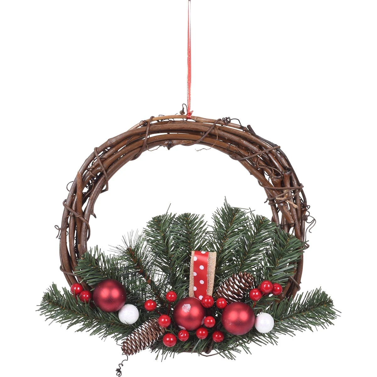Questo Fuoriporta a forma di Corona, dotato di rametti di pino e decorazioni di colore rosso e bianco, è la soluzione ideale per addobbare con stile e raffinatezza la tua portina di casa durante il magico periodo delle festività natalizie.
