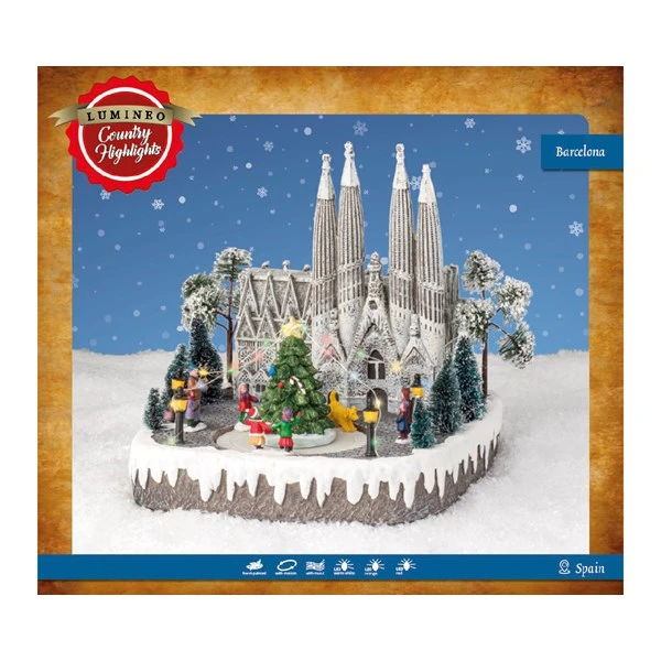 Questo villaggio di Natale, provvisto di effetti animati, è perfetto per rendere magiche le tue festività natalizie e può essere utilizzato per conferire un tocco di stile in più sia ai tuoi ambienti domestici, sia a locali commerciali. Questo villaggio, inoltre, è la riproduzione di uno scorcio della città di Barcellona, in particolare la maestosa Cattedrale della Sagrada Familia, imbiancata da una soffice coltre nevosa, in un magico giorno d’inverno.